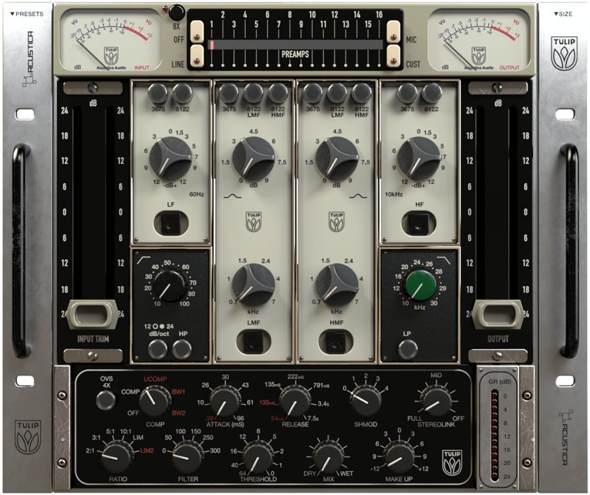 Tulip Comp: A solid-state VCA compressor/limiter; featuring four different switchable dynamic processor emulations: the original model, called Comp; a “Frankenstein” mode created by Acustica called Ultracomp based on our Hyper compression technology; two different brickwall limiters; plus a compressor preamp emulation.