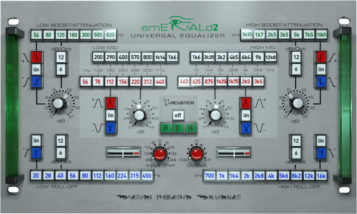 The Emerald 2 E200 is a dual-mono “homebrewed” EQ emulation inspired by an iconic German parametric equalizer. It features a preamp stage, and 7 individually switchable, fully tunable filters with variable Q ranging, from extremely narrow notch filtering to wide, bell-shaped curves. Plus, it features a +/-12dB gain/cut control, shelving bass (60Hz) and treble bands (10kHz), and low/high-cut filters with 36dB/oct, making this EQ a truly universal problem solver.