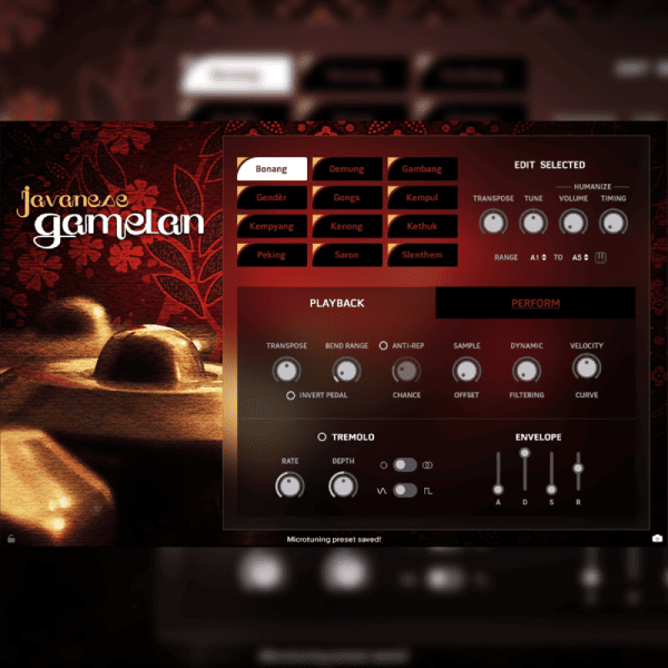The single instrument patches are presented in two idiomatic tunings – Pelog and Slendro – as well as equal temperament, suitable for traditional Western music. The ensemble builder allows for per-instrument tuning, mixing, effects, and humanization, allowing you to create your own custom blend of tones in whatever note ranges you choose.