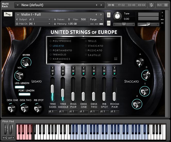 - 多种真实连奏集,包括普通连奏和滑音连奏,在不同的动态下(可以用MIDI CC1交叉渐变)。