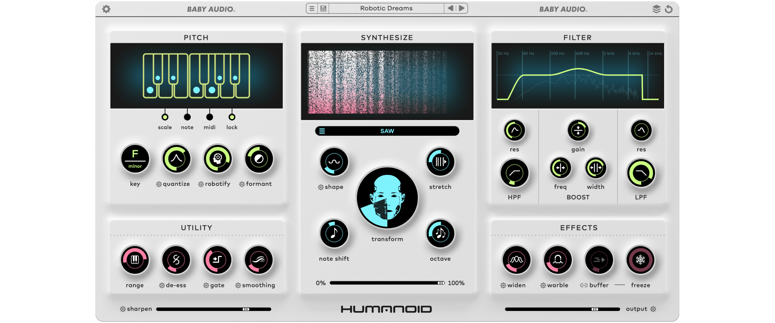 At its most extreme, Humanoid will turn a voice fully into a synthesizer, while moderate settings will add a subtle electronic shine to the vocal mix.