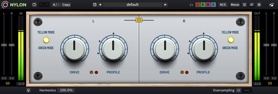 Inspired by a unique and captivating circuit, Nylon offers two modes of coloration: Yellow for shimmering highs and Green for robust lows. Both are ‘Transparent Overdrive’ effects that add subtle harmonic content, gentler than typical saturators.