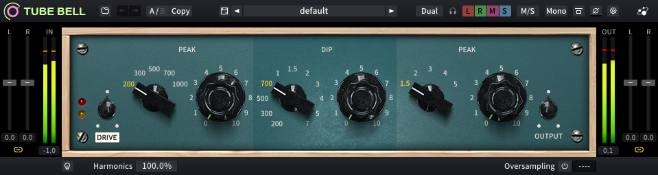As a complement to Tube Shelf, Tube Bell is primarily responsible for mid-frequency processing. It features two Peak sections and a Dip section, all utilizing Bell-type filters.