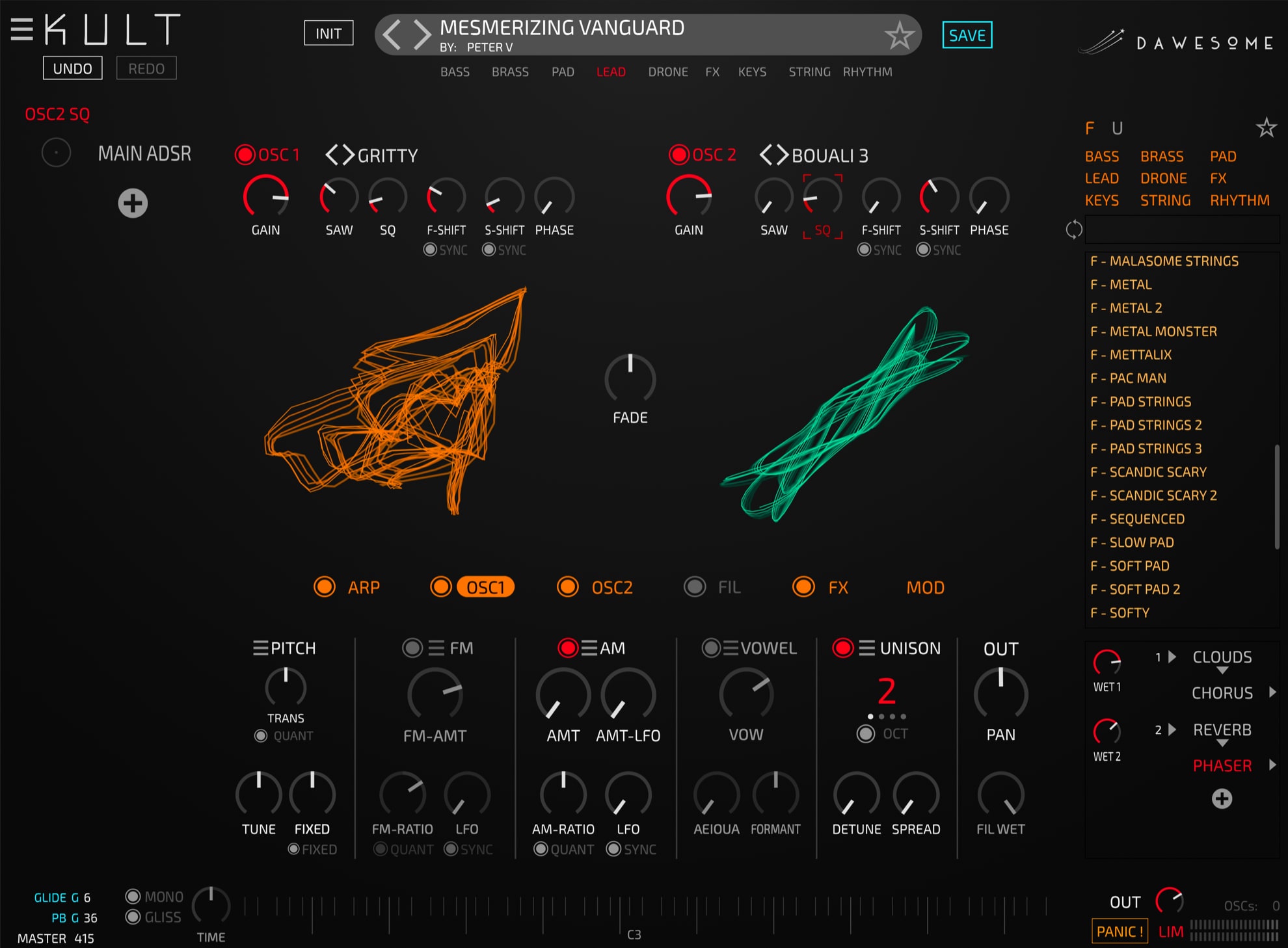 The sound engine of KULT represents and sculpts sound as curves in a 2D space – this innovative approach to synthesis allows unprecedented possibilities to shape the sound. The real magic when designing sounds comes from the mesmerizing visual feedback. Ever struggled to really understand FM synthesis? Try it in KULT and you will be enlightened!