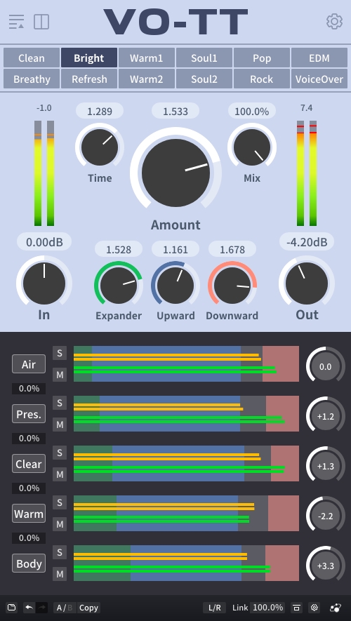 VO-TT (VOcal-oTT) is an intuitive OTT-style multiband dynamics processor, uniquely designed for vocal mixing. With minimal tweaks, VO-TT works its instant magic, transforming any vocal content into a balanced, professional sound.