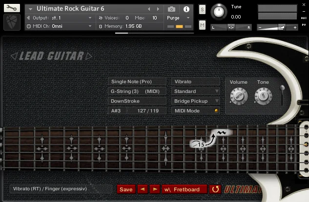 SIX STRING AUDIO introduces ULTIMATE ROCK GUITAR, the most detailed multi-sample-library of a custom electric rock guitar up-to-date with 23 different articulations added by 34 Chord Groups, Special Chords and further extras, resulting in over 45 GB sample material of only one pickup, the bridge humbucker pickup, compressed to 26,4 GB with Native Instruments’ lossless audio compression!