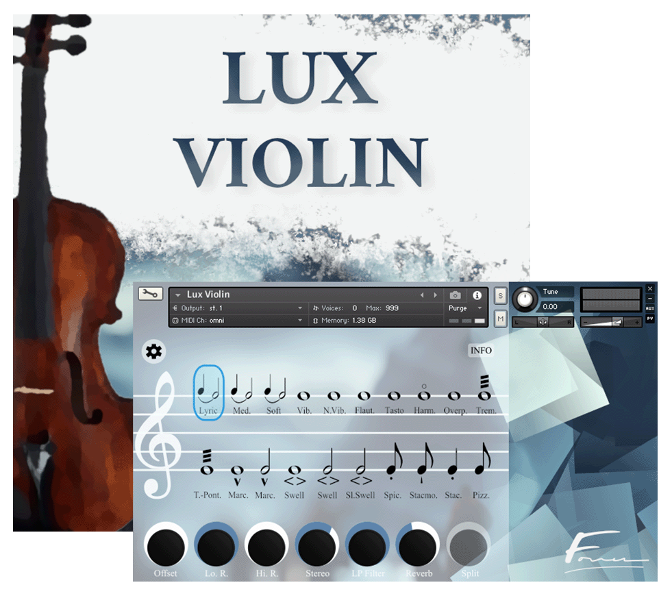 Lux Voilin features a wide variety of articulatoins coverinq the lowest to the hiqhest dynamic ranqes. Leqato, harmonics, flautando, 3 types of swells and much more.