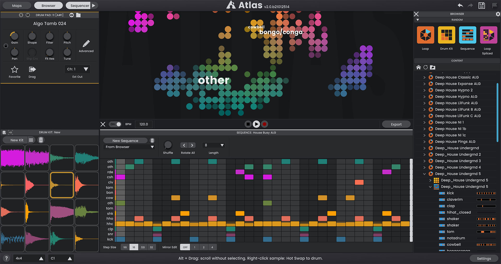 The Atlas 2 drum machine and sample manager brings new features such as a fast and powerful Drum Sequencer, Sample Variation/Humanization engine, and a new Content Browser that makes managing and recombining drum kits and sequencers easy. On top of this there are hundreds of smaller improvements to every aspect of the original Atlas.