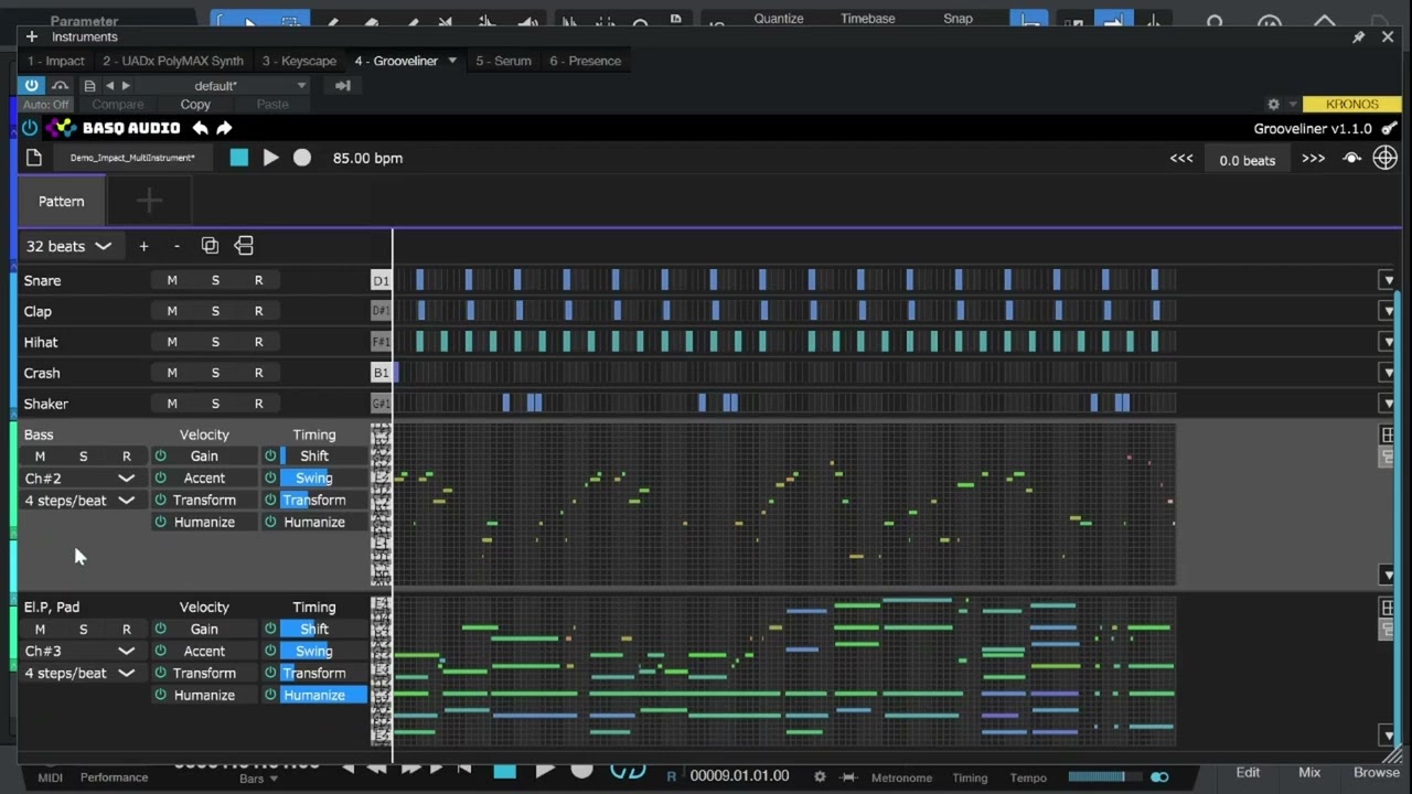Experiment with rhythms, such as the impact of accents and micro-shift effects. You can compare the effects in real time.