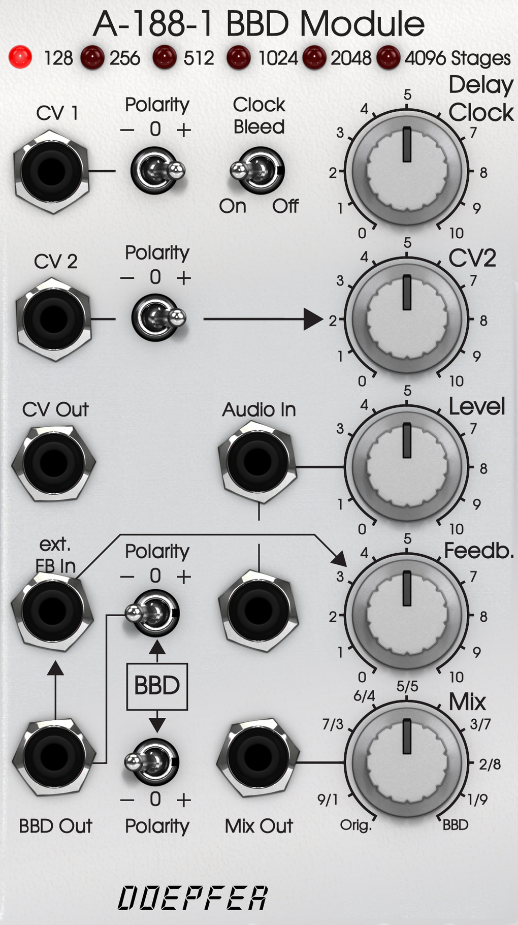 By passing your signal along a line of capacitors, the BBD delays your sound in time, but also degrades it with high-frequency loss and additional noise (as well as noticeable sample-rate reduction and aliasing at high delay times). This creates a warm and dirty effect, much sought after in the mid/late ’70s, and still loved.