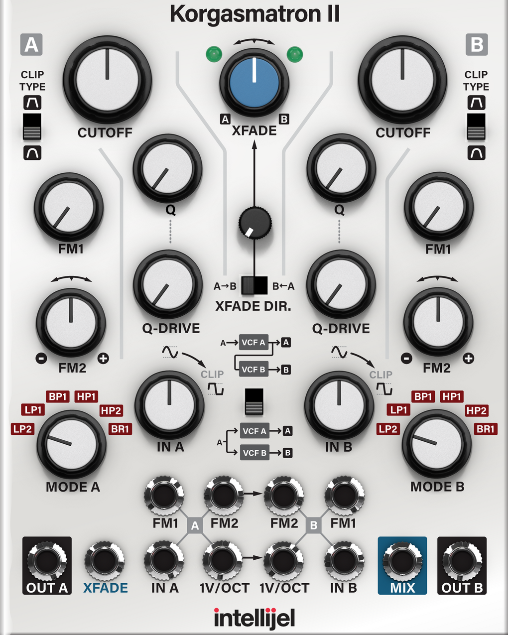 Taking inspiration from a classic Japanese synth, Intellijel Korgasmatron II is a dual voltage controlled filter which can also be used as a limited oscillator. Any sound passed through it comes out richer, more nuanced, more fiesty and colorful, largely due to the distortion characteristics of the resonant drive controls on each filter, and the fact that you can modulate and blend between two bold filters on settings as widely divergent as you like.
