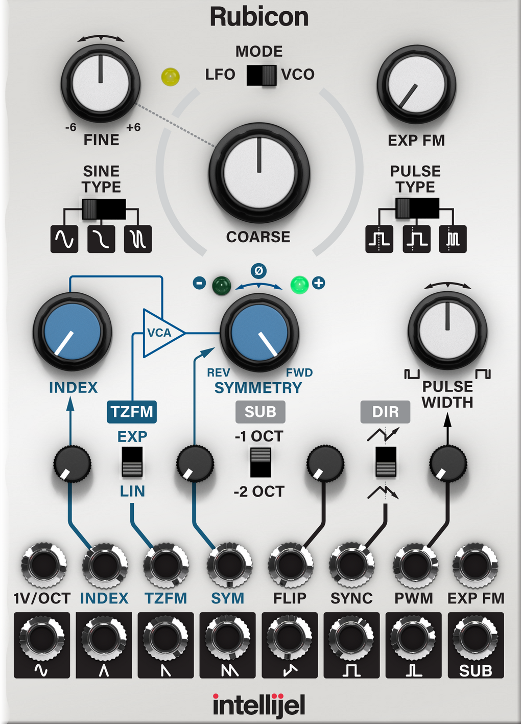 The Rubicon, from Canadian Eurorack wizards Intellijel, is an analog triangle core VCO, capable of thru-zero frequency modulation. Originally created by Dave Dixon, it is rightly considered an analog VCO design masterpiece.