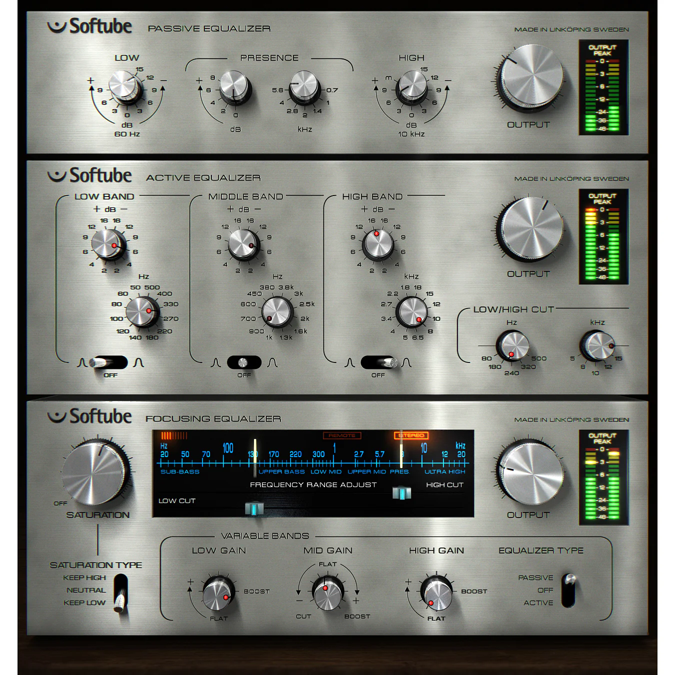 The Passive and Active equalizers emulate real workhorse units, used on thousands of recordings from past to present. The Focusing Equalizer, an original creation of Softube’s, combines these with analog saturation and a novel workflow, to give you musical results, and a wonderful sound every time.