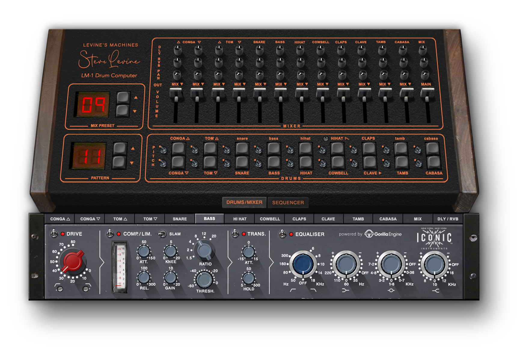 The sound of the Levine’s Machines – Drum Machine is instantly recognizable, and it can be tuned and manipulated (just like the original) to create a unique footprint for your tracks. But in addition to the original sounds and sound-shaping, the Levine’s Machines – Drum Machine by Iconic Instruments offers a full-featured sequencer, and a full mixing environment, with channel and mix bus effects chains, which include Drive, Compressor/Limiter, Transient Control and 4-band British-style EQ, all modeled from specific classic gear that Steve used in the 1980’s. There are channel and mix bus send effects, which are emulations of Steve’s most-used 80’s-era digital delay and reverb units. Each channel and effect can be bused within your DAW to a unique output, so that you have the option of printing or mixing in your DAW, rather than within the Levine’s Machines – Drum Machine. And finally, the Levine’s Machines – Drum Machine comes packed with 20 Mix and Pattern presets, crafted by Steve himself, to give you ready-to-use drum sounds, or to use as a starting point for your tracks.