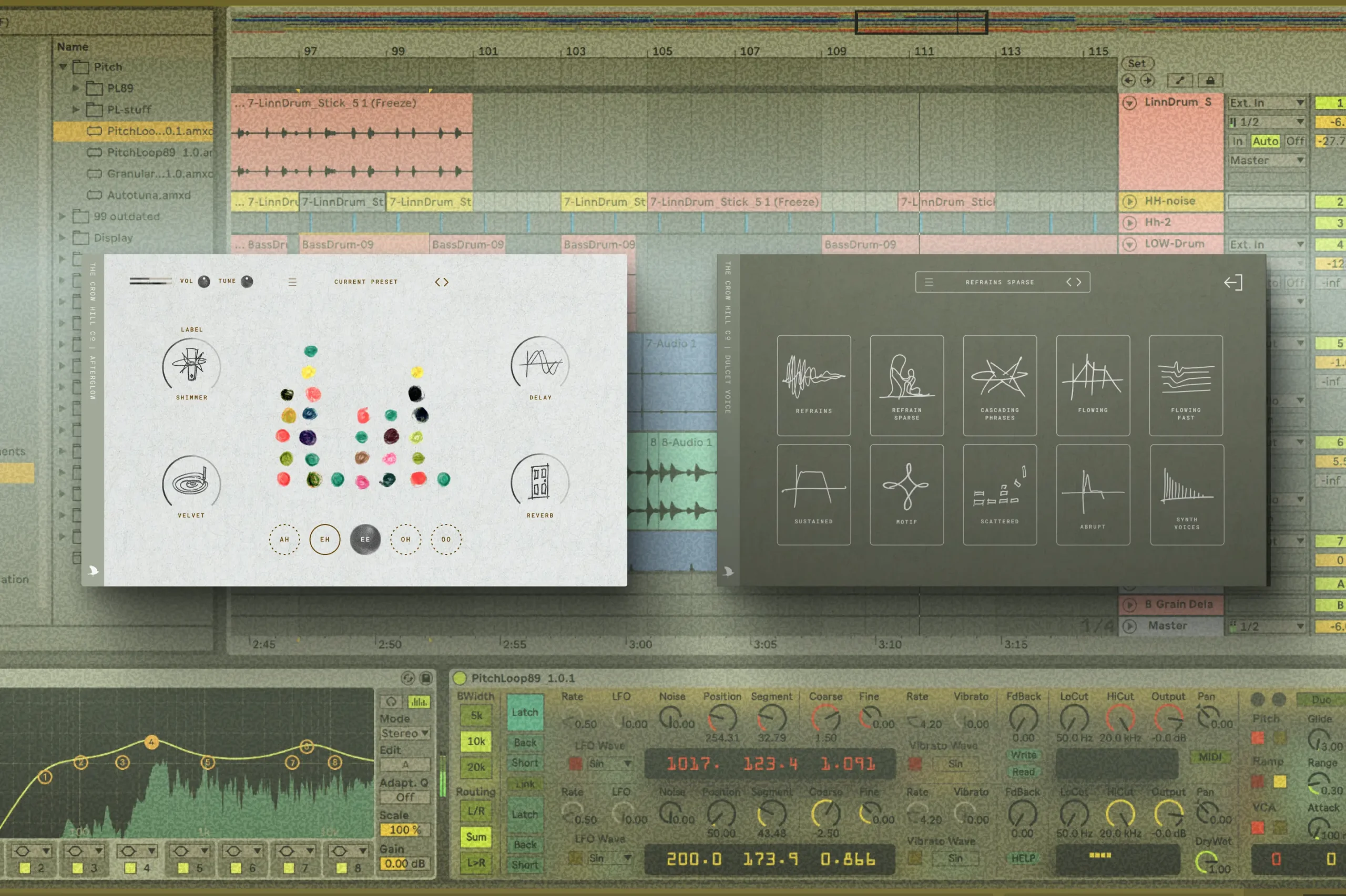 Full effects suite featuring dual algorithmic Reverbs, modulated Delay and cascading Granular re synthesis