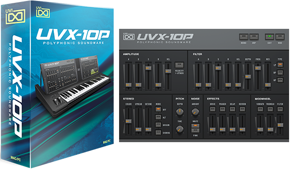 UVX-10P delivers a fully-featured and fully-programmable interface sporting ADSR control of our high-quality amp and multimode filter designs, multiple effects, LFO and step modulator, a tediously crafted library of 150+ patches and even original wave samples for you to create your own programs with.
