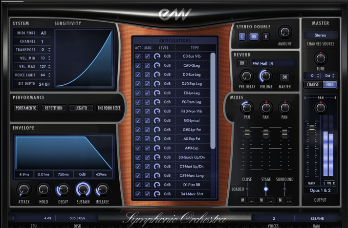 To achieve the feel of a live concert hall performance, each instrument and section was recorded with three mic positions: close, stage (conductor’s position) and hall. By selecting different mic positions, you can mix these sounds together to create virtually any placement or level of depth desired. This all but eliminates the need for artificial reverb, drastically cutting down on the amount of time you spend getting your ambience settings just right. Every major adjustable feature can be controlled from a single interface, including reverb, mic positions, filtering, and section volume. If you’re looking for warmth and the ability to easily manipulate nearly any aspect of the instruments’ performances to your heart’s content, Symphonic Orchestra gives you every tool you need in one place.
