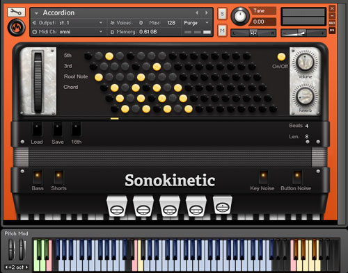 A real accordion has a very distinctive style of playing which you can easily emulate by using the on-board chord sequencer within Sonokinetic Accordion.