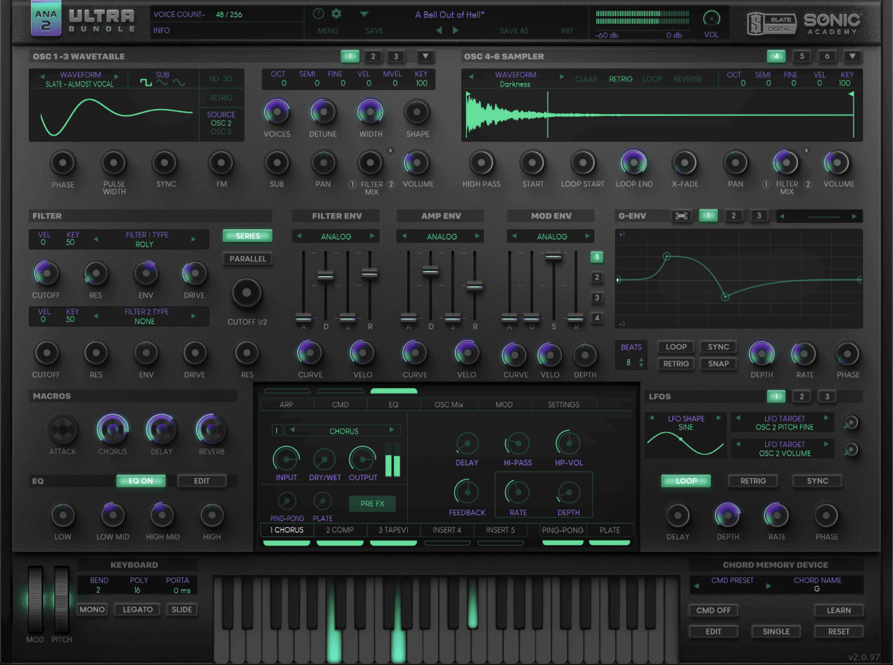 ANA 2 Ultra offers a huge range of sonic possibilities, with 3 wavetable oscillators, 3 samplers, and 46 different filter types. And it comes with hundreds of patches, ranging from hip-hop to cinematic to lo-fi sounds.