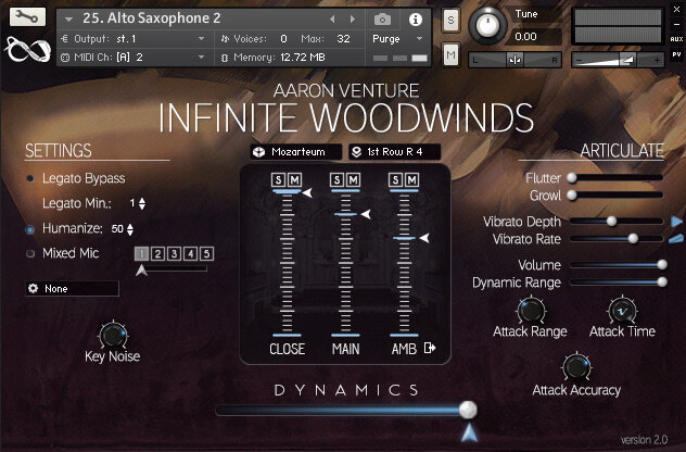 Infinite Woodwinds also includes playable Flutter, Growl, Vibrato Rate, Vibrato Depth sliders, as well as Attack Time and Attack Range knobs which allow you to adjust the attack response to your play-style.