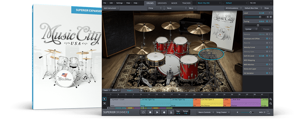 On top of that, it features a unique Slingerland* Vintage 1968 set and a wide range of snares and cymbals as well as an extensive MIDI library.
