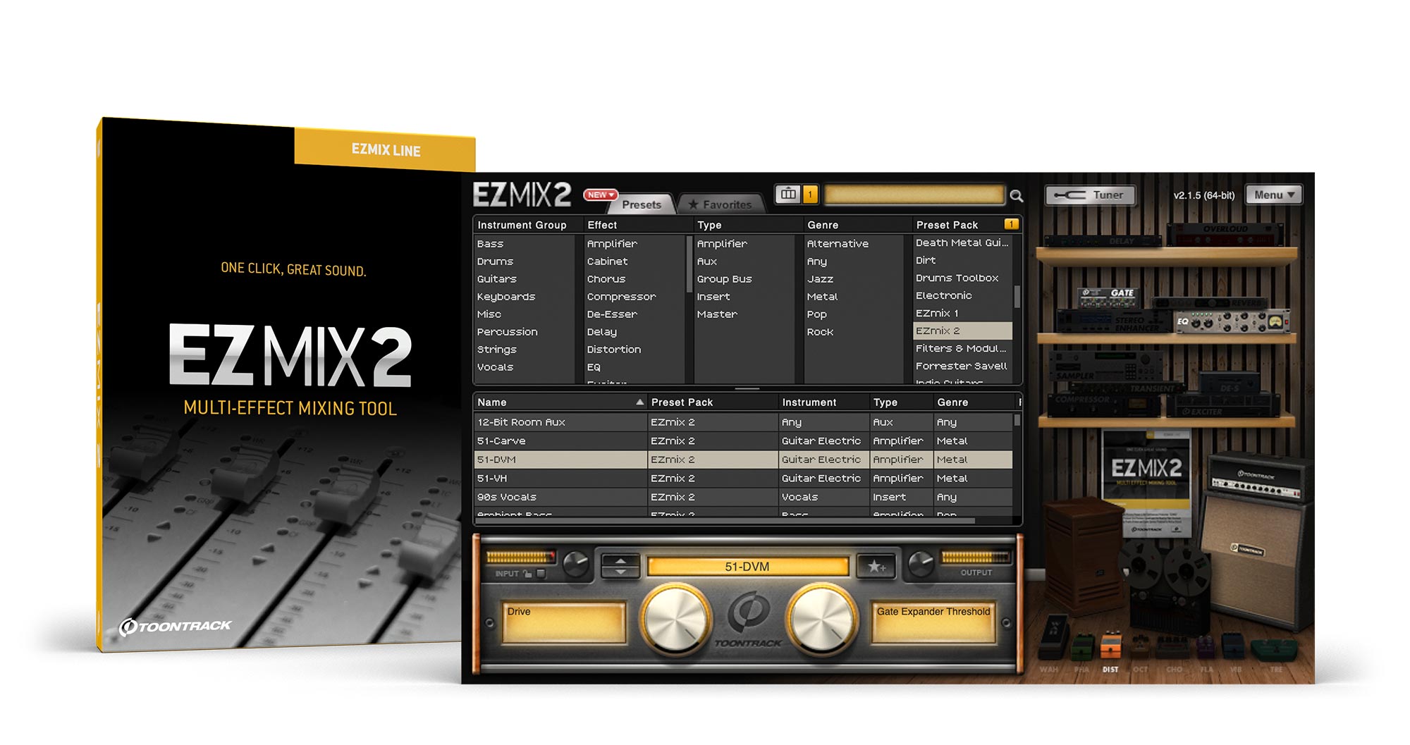 Following the success of Toontrack’s EZmix, the new and completely overhauled EZmix 2 continues to build on the same fundamental idea: having pro-designed effect chains for instruments and channels found in every recording session combined in one powerful mixing tool.