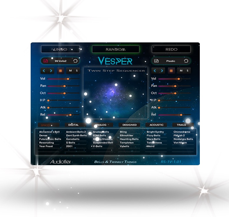 Vesper comes with 135 sound sources loadable in 2 different slots, plus 20 Trails.