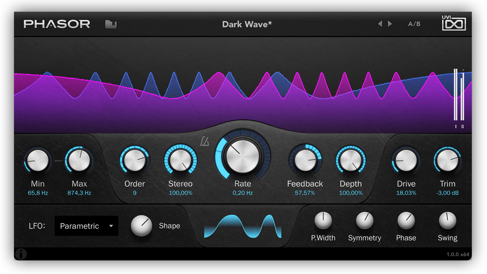 Phasor is a powerful and dynamic studio tool, offering up a broad palette of modulation, filtering, and distortion effects thanks to its unique multimode design and deeply configurable parametric LFO. From buttery stereo field enhancement, to rhythmic reinforcement with tweakable LFO waveshape and swing, to more creative and specialized effects utilizing min and max frequency range, feedback, and drive, Phasor is featured and easy-to-use, delivering exceptional sound quality across a wide range of sweet spots.