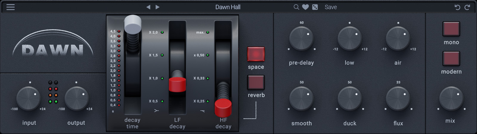 Dawn gives you access to the full range of reverb times from the original unit, from 0.4 seconds through to 4.5 seconds, alongside the distinctive Low Frequency Decay and High Frequency Decay (damping) controls.