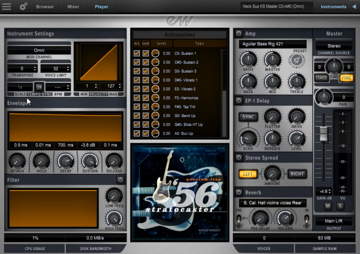 On the face of the Play instrument for Strat 56 you will find an envelope used for shaping your sounds, a filter both high pass and low pass used for removing unwanted frequencies such as rumble, stereo spread which actually works incredible well with this strat 56 sampler, an EP-1 delay and amp and reverb.